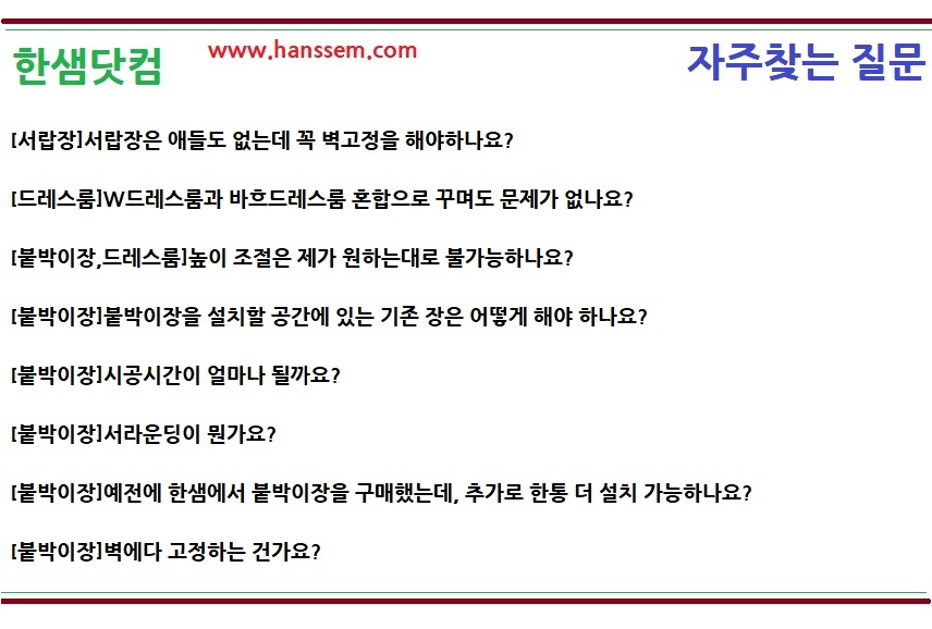 붙박이장 설치할 곳에 있는 기존 장은 제품이 설치 되기 전에 미리 치워 놓아주셔야 시공 가능합니다.