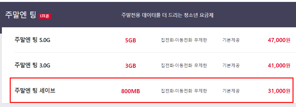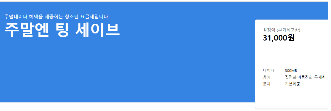 sk t월드 주말엔 팅 세이브 요금제 800MB 기본데이터와 주말 전용데이터.