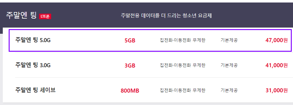 SKT 티월드 주말엔 팅 5.0G 요금제 주말 전용데이터 일 1GB 제공.