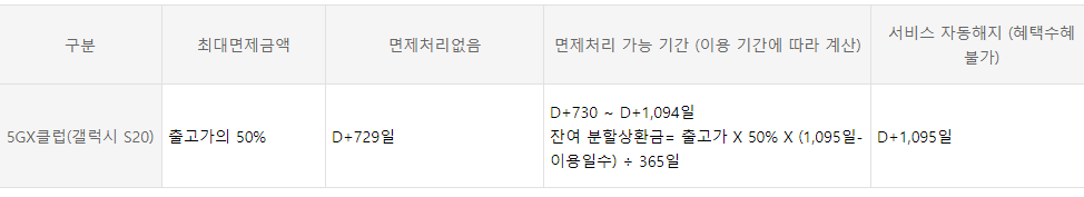 - 5GX클럽(갤럭시 S20) : 서비스 가입 후 25개월차~ 36개월차(12개월)