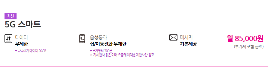 엘지 유플러스 5G 스마트 요금제데이터 무제한 안내.