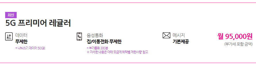 유플러스 5G 프리미어 레귤러 요금제 LTE 요금 그대로 약정할인.