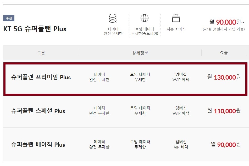 KT 5G 슈퍼플랜 프리미엄 Plus 요금제 데이터 제공.